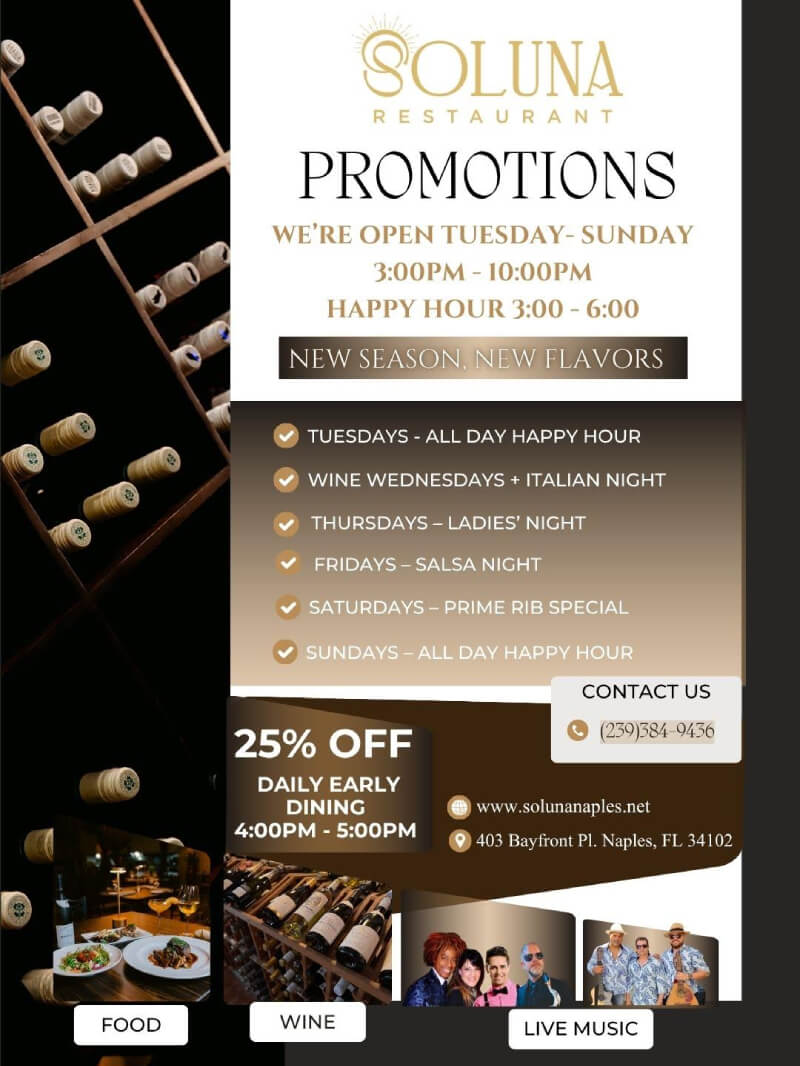 Ready to plan your special event? Contact Soluna Restaurant at 239-384-9436 to start planning your special event.