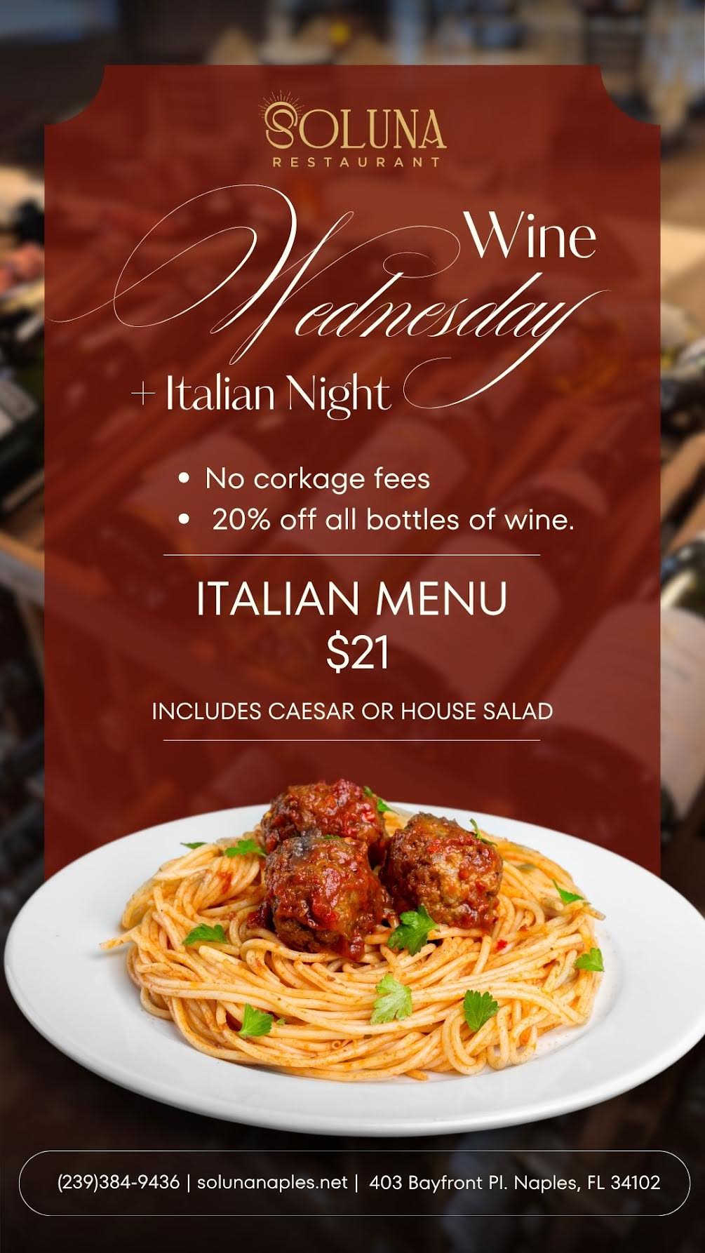 Beyond private events, we host regular special occasions throughout the year, including wine dinners, themed supper clubs, and seasonal celebrations. Each event at Soluna combines exceptional food, attentive service, and the perfect Naples atmosphere for creating lasting memories.